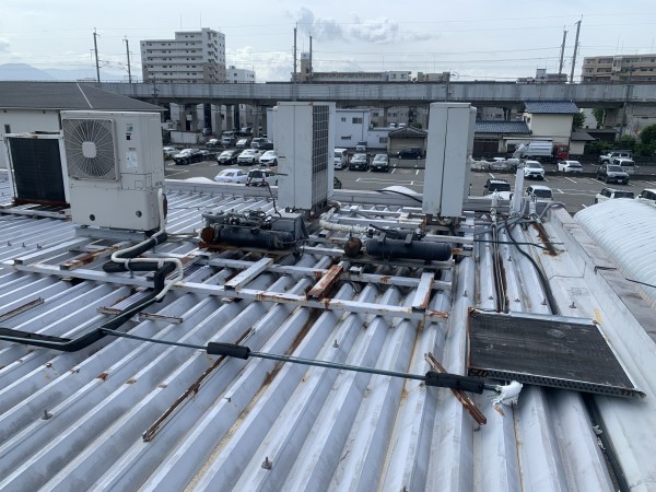 少し前になりますが、福岡県某所にて屋上に設置した機器類を地上へ移設する工事を行いました。天井材の老朽化により、雨漏り等が発生し天井への負荷を軽くする必要があったからです。真夏の時期の工事だった為、直射日光が激しく天井も熱々で、まるでフライパンの上のソーセージの気分でした。冷凍庫を冷やす前に自分を冷やさないといけないぐらいの暑さではありましたが、安全第一で無事施工完了です。